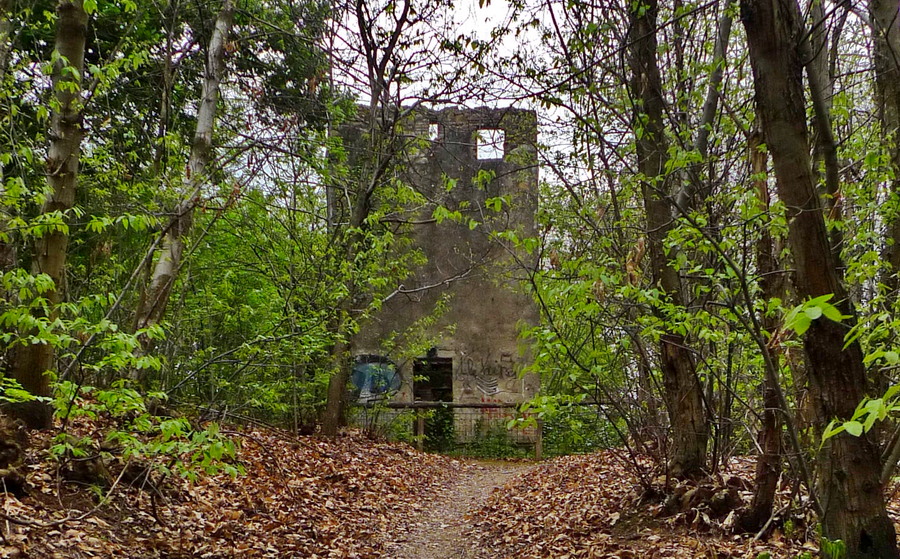 In fondo alla stradella si trovano resti di mura con un cancello e un imponente frassino secolare.